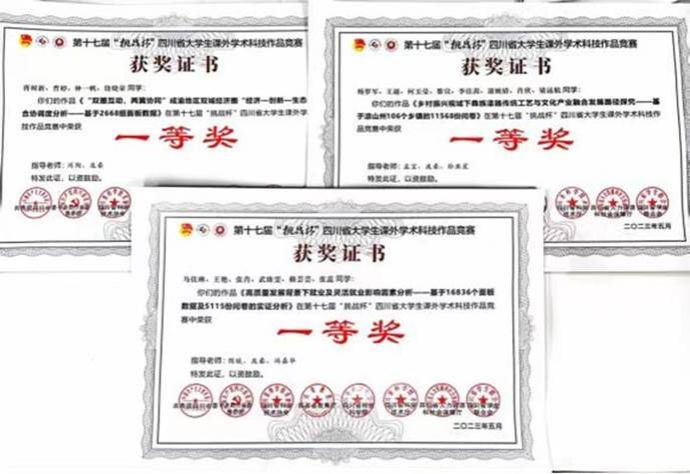 自今年三月正式启动以来,法管学部积极响应号召,精心组织竞赛,广泛动员学生参与。本届挑战杯竞赛全校共有457件作品通过预审进入终审决赛,法管学部获奖作品共计157件,获奖作品占比达53.76%;哲学社会科学类获奖作品占比达64.58%,一等奖18件,占比达75%;二等奖57件,占比达61.95%;三等奖80件,占比达64.51%。全校最终共计10件作品进入省赛终审决赛环节,法管学部有5件,占比50%。其中《“双圈互动,两翼协同”成渝地区双城经济圈“经济—创新—生态”耦合协调度分析—基于2668组面板数据》、《乡村振兴视域下彝族漆器传统工艺与文化产业融合发展路径探究—基于凉山州106个乡镇的11568份问卷》、《高质量发展背景下就业及灵活就业影响因素分析--基于16836个面板数据及5115份问卷的实证分析》获得省级一等奖;《长江经济带“经济发展-科技创新”空间差异分析--基于126个地级以上城市的局部莫兰指数》、《下好巩固棋,走出振兴路—基于宜宾市翠屏区脱贫巩固的调查研究》获得省级二等奖;