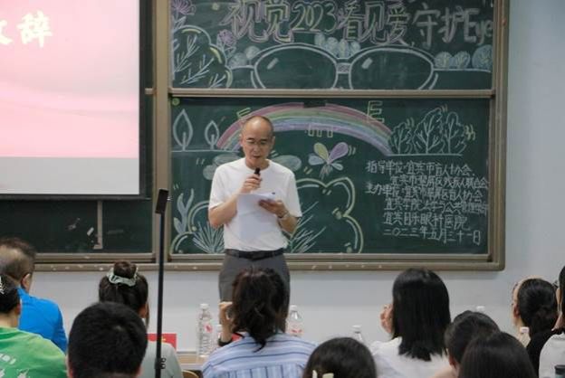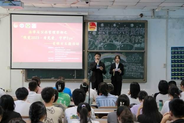为落实学习贯彻习近平新时代中国特色社会主义思想主题教育内容,迎接第28个全国“爱眼日”的到来。5月31日,法学与公共管理学部(下简称:法管学部)于初心楼213教室开展了以“视觉2023•看见爱,守护Eye”为主题的爱眼日主题活动。宜宾市盲人协会副主席、翠屏区盲人协会主席黎洪,目乐眼科总经理兰成賓,近视防控中心主任马建华,科视光部总监胡萍,法管学部党总支副书记张波以及团总支学生会主席团成员出席本次活动。