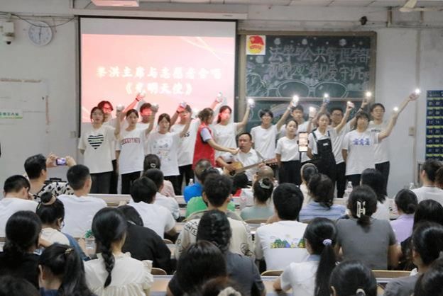 黎洪先生与在场同学分享了残障人士故事,精彩演奏了其原创作品《看一眼》,用动听的歌声带领观众们感受视障人士的心愿,唤起现场观众情感共鸣。随后,其与志愿者们一同合唱歌曲《光明天使》,以音符为伴,结束了本次活动。最后,领导与嘉宾们一起在喷绘上签名并合影留念。