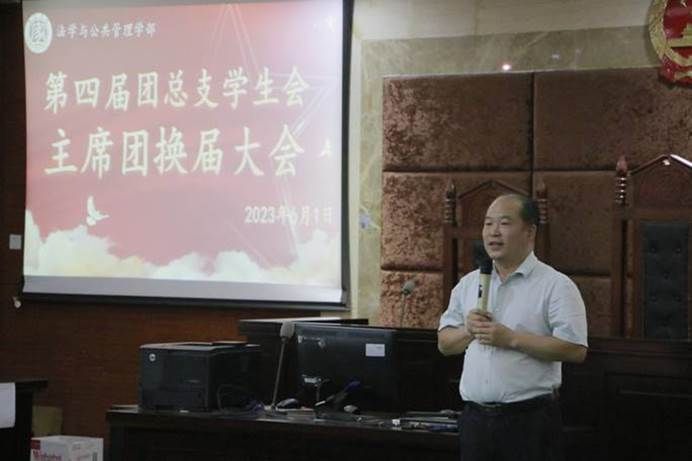 为落实学习贯彻习近平新时代中国特色社会主义思想主题教育内容,增强学生组织的新生力量,为学生会工作提质赋能,法学与公共管理学部(下简称:法管学部)分别于6月1日、6月3日在初心楼模拟法庭、初心楼213教室开展了第四届团总支学生会主席团换届大会、学生会部门换届大会。法管学部部长陈世海、党总支副书记张波、团总支书记王燕、学工办教师曾晓琴、杨肖、罗雪娇、刘顺鑫、陈利敏以及团总支学生会主席团成员出席。会议由第三届团总支副书记李小燕主持。