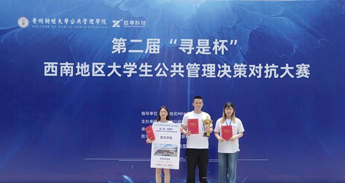6月3日至4日,由贵州省行政管理学会主办的第二届“寻是杯”西南地区大学生公共管理方案设计与决策对抗大赛在贵州财经大学举行。宜宾学院代表队由法管学部徐向峰、游宇担任指导老师,与晏艳老师共同带领邓茗月等3位学生参赛,经不懈努力,最终荣获二等奖。