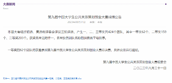 2023年8月31,第九届中国大学生公共关系策划创业大赛公布比赛成绩。我院法学与公共管理学部(下简称:法管学部)公共关系学专业学子表现优异,共斩获二等奖1项,三等奖3项。