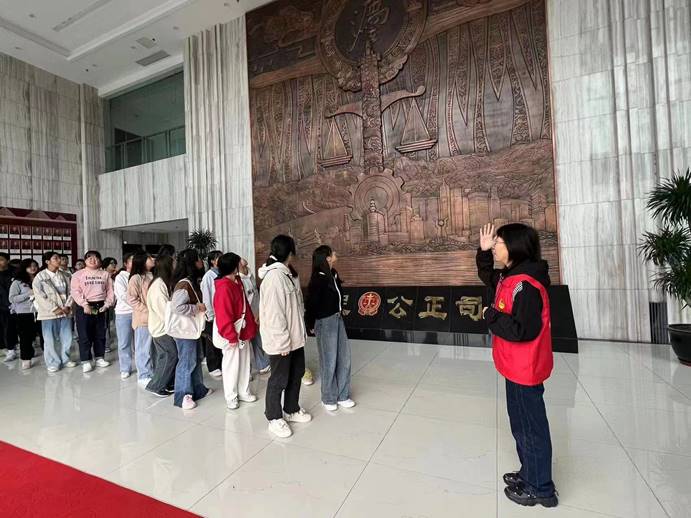 在去往审判庭的路上,法院的志愿者姐姐带领同学们进入法院大楼参观,她为我们介绍了立案服务中心和诉讼调解中心等。最令人印象深刻的是在一楼的大厅里有一面墙上是象征着法律公平正义的天秤浮雕,既让人感觉到法律的威严,也让人感受到国家对于法治建设的理想追求。当聚光灯打下时,巨大的法字光辉就像阳光照耀着每一个人。