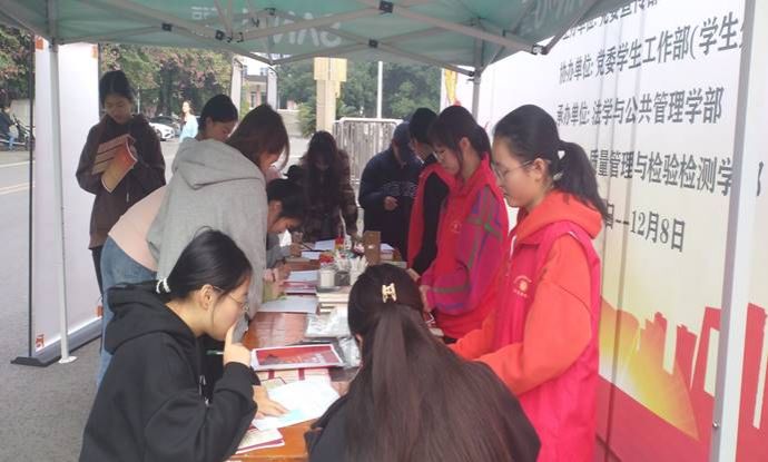 本次系列活动先行开展了为期五天的宪法宣传。11月27日8:00,志愿者们于旗台前完成集结后,便开始摆放活动海报、设立宪法咨询点,而后顺利完成了宣誓签名展架的搭建,为接下来的宪法宣传活动做好了充分的准备。