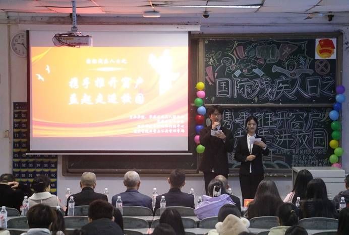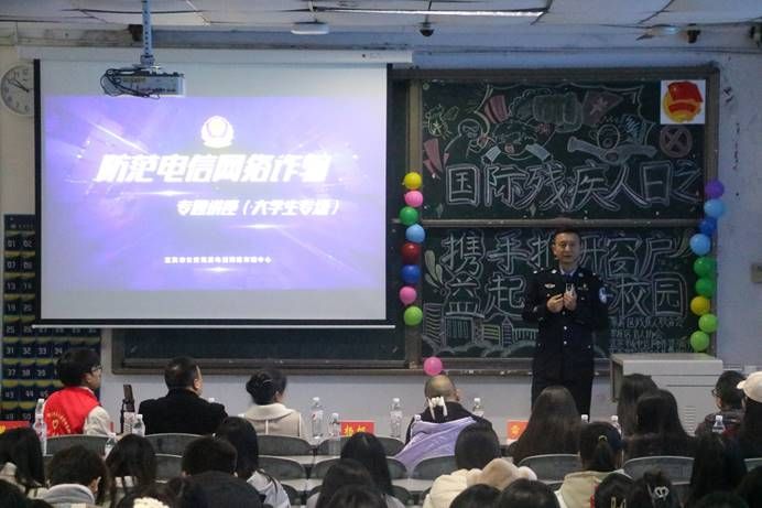为落实贯彻践行“三全育人”教育理念,提高广大学生与视障人士对电信网络诈骗的防范意识和预防能力,同时倡导对视障人士给予关怀帮助的理念,助力构建和谐稳定的社会环境,12月1日,法学与公共管理学部(下简称:法管学部)于初心楼202教室开展了以“携手推开窗户,益起走进校园”为主题的国际残疾人日系列活动。宜宾市公安局刑侦支队情报大队副大队长杨帆、翠屏区盲人协会主席黎洪、翠屏区盲人协会副主席申雪、翠屏区残疾人联合会(下简称:残联)副理事长陈照聪、残联党组书记郑琳、残联维权股股长袁志清、残联工作人员雷月琴、法管学部党总支副书记张波、学生工作办公室教师王馨、谢明聪以及团总支学生会主席团部分成员出席本次活动。