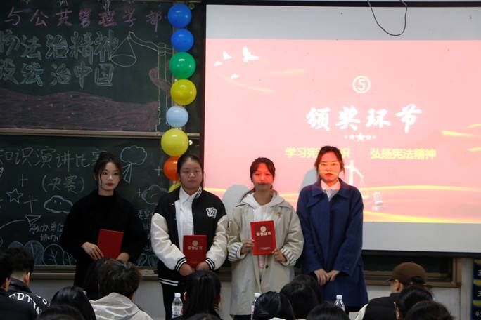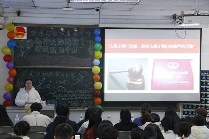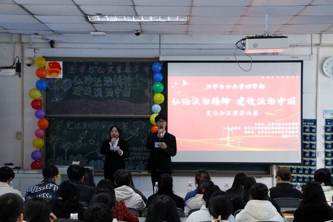 2023年12月4日为第十个国家宪法日。为落实贯彻践行“三全育人”的教育理念,培养广大青年法治观念,营造良好法治校园氛围,12月4日,由宜宾学院党委宣传部主办,法学与公共管理学部(下简称:法管学部)协办的主题为“弘扬法治精神,建设法治中国”的宪法知识演讲比赛于初心楼104教室举行。法管学部学生工作办公室教师李成龙、陈利敏、曾晓琴以及团学会主席团成员莅临本次活动并担任评委。
