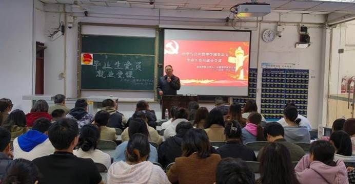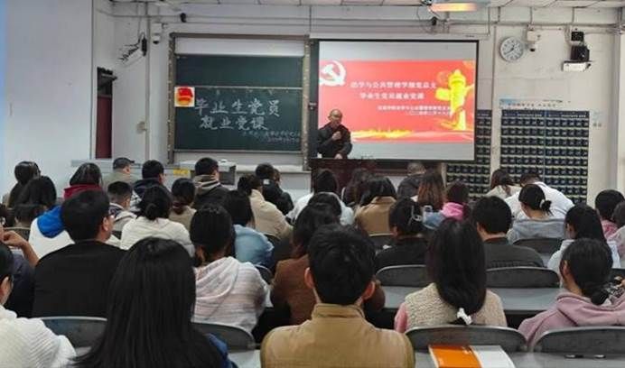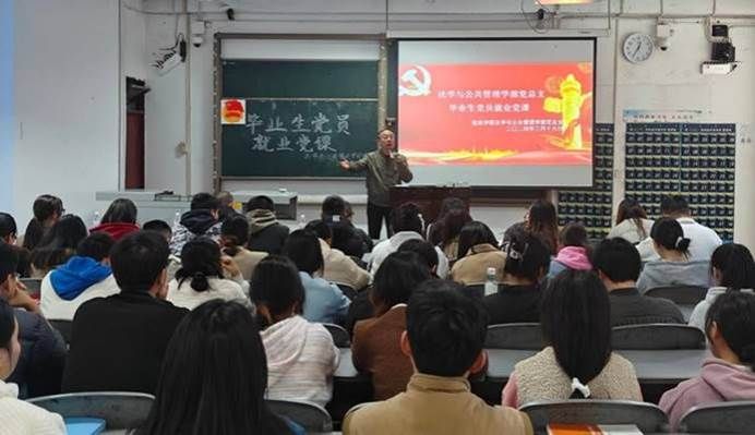 为充分调动毕业生党员就业主动性、积极性,带动其发挥先锋模范表率作用。3月19日,法学与公共管理学部(下简称法管学部)党总支于初心楼104教室举行毕业生党员就业主题党课。由法管学部党总支副书记刘廷华(负责工作)、法管学部党总支副书记张波,正处级组织员蒲东升,第一学生党支部书记杨肖、第二学生党支部书记陈利敏、第二学生党支部组织委员谢明聪,第三学生党支部书记王馨出席本次大会。
