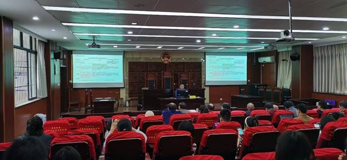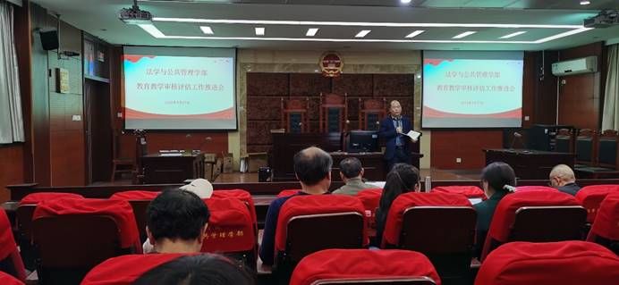 会议伊始,法管学部副部长周陶给全体教职员工开展了教育教学审核评估培训,强调了审核评估工作的重要性。并指出,审核评估工作中需要老师们按规定时间内提供各项教学资料,保证各项资料的准备充分,以及线上听课,线上材料审阅等注意事项。