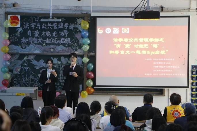 为助推无障碍环境建设,进一步弘扬全社会助残扶残良好风尚,增进广大青年学子对残障人士的理解与关怀,值此“国际导盲犬日”来临之际,宜宾学院法学与公共管理学部(下简称:法管学部)团总支青年志愿者队特联合宜宾市翠屏区盲人协会、中国狮子联会四川酒都狮爱服务队、宜宾光明天使志愿服务队于宜宾学院A区初心楼214教室开展了以“有‘爱’才能无‘碍’,和导盲犬一起为Eye启航”为主题的公益服务活动。翠屏区盲人协会主席黎洪、翠屏区盲人协会副主席申雪、中国狮子联会四川代表处纪律与行为规范委员会主席何涛、红色行动工作组主席李华蓉、酒都狮爱服务队2018-2019年度队长傅兴君参与本次活动。