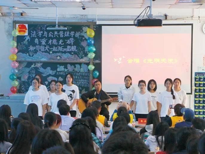 最后,黎洪和法管学部团总支青年志愿者队的志愿者们一起为大家带来了原创歌曲《光明天使》,迎来了台下观众一阵又一阵热烈的掌声,伴随着欢快的歌声,本次活动画上了圆满的句号。