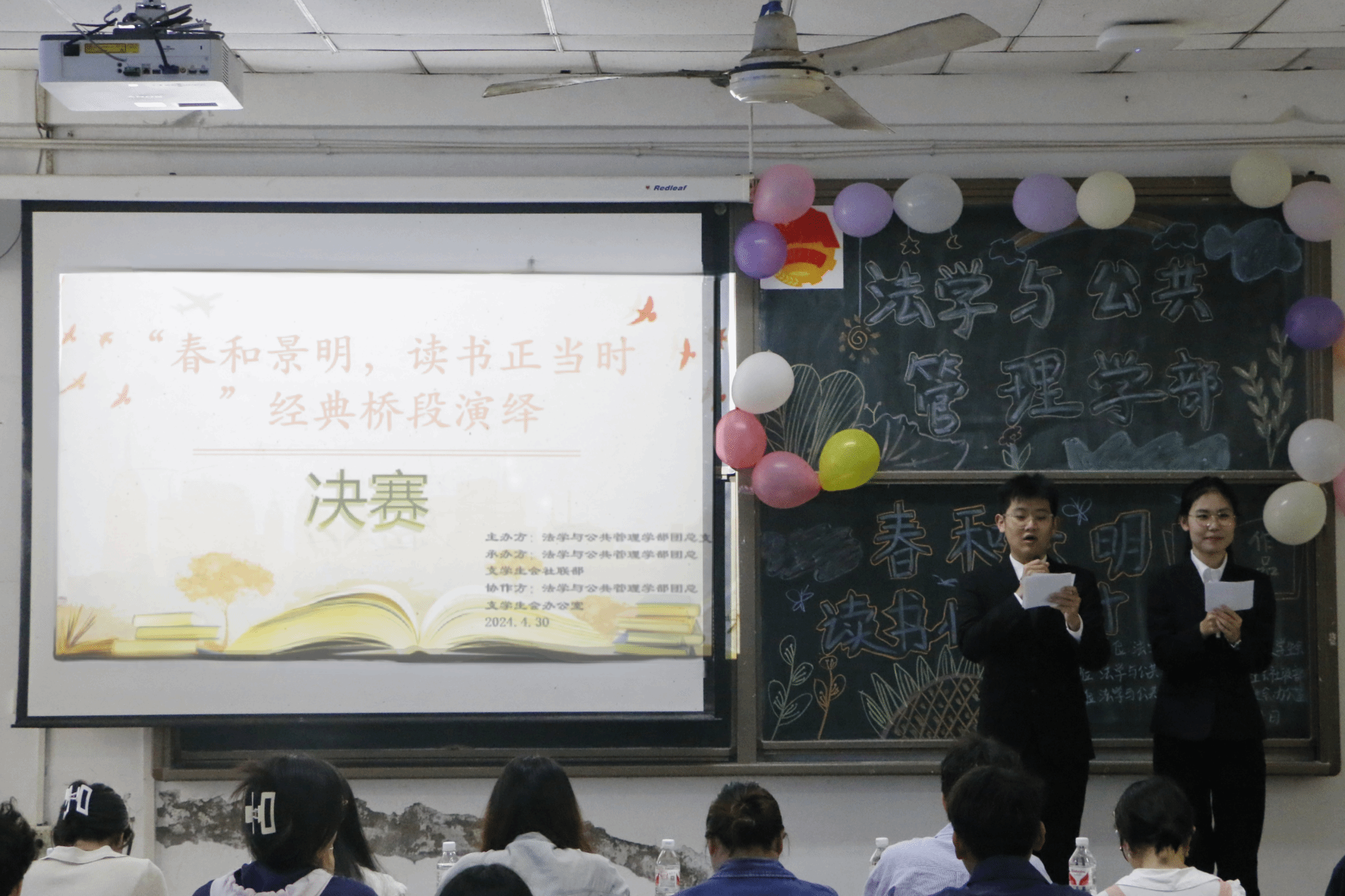 为落实贯彻“三全育人”教育理念,让文学经典走进校园,鼓励学生传承和发扬中华优秀传统文化,法学与公共管理活动(下简称:法管学部)于4月30日在初心楼104教室举办了以“春和景明,读书恰当时”为主题的经典片段演绎活动。学生工作办公室教师杨肖、陈利敏、曾晓琴以及团总支学生会主席团部分成员受邀参与此次活动并担任评委。