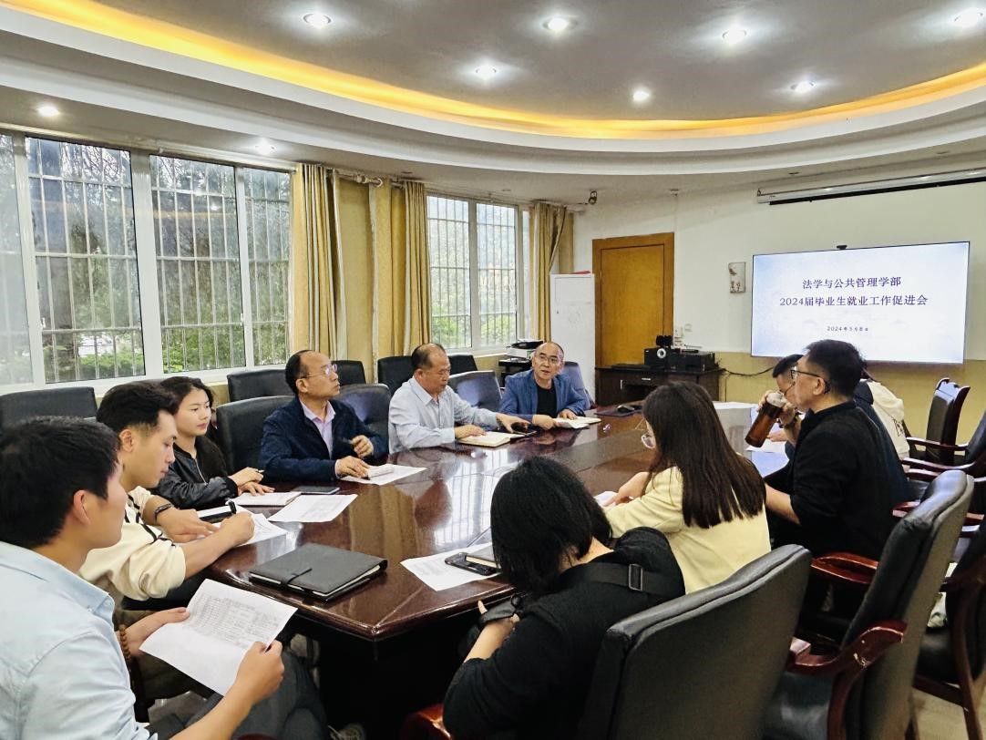 为全面贯彻落实党中央、国务院、省教育厅对高校毕业生就业创业工作的决策部署,积极落实就业优先战略,进一步推进法学与公共管理学部(以下简称法管学部)2024届毕业生就业工作落实落地,实现毕业生更充分和更高质量就业,5月8日,法管学部于初心楼116会议室召开2024届毕业生就业专题工作再次推进会,分析当前形势,进一步研讨部署2024届毕业生就业工作,法管学部部长陈世海、正处级组织员蒲东升、党总支副书记张波以及学部全体毕业班班主任参加本次会议。