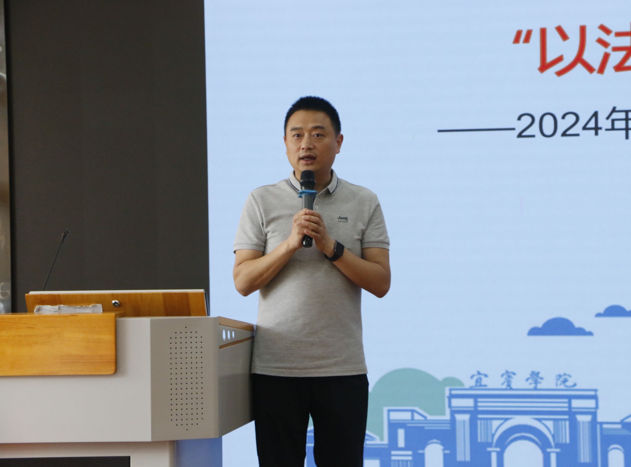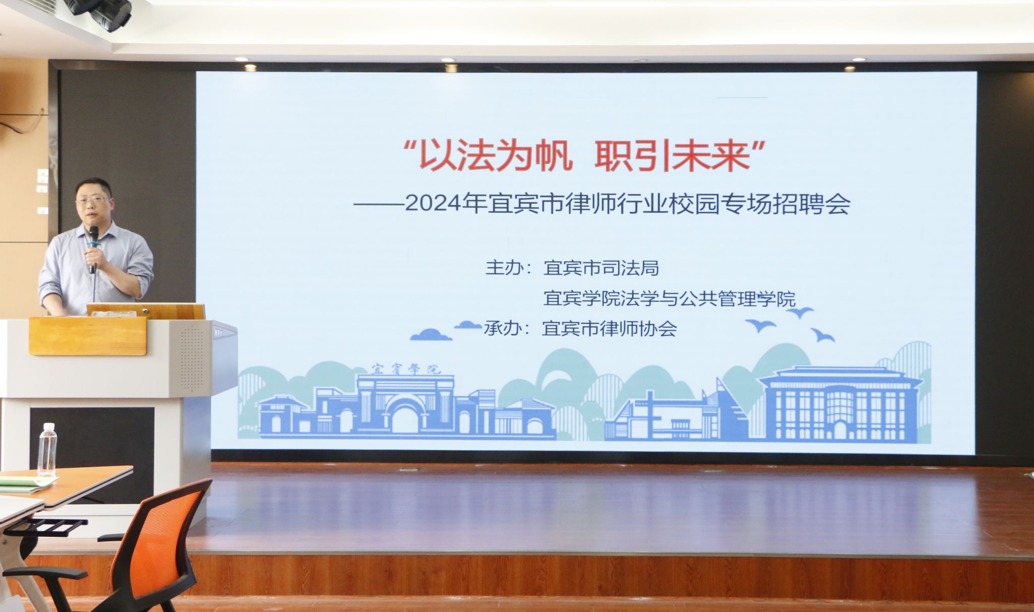 为落实贯彻“三全育人”教育理念,拓宽毕业生就业渠道,提高毕业生就业质量,5月15日,由宜宾市司法局和宜宾学院法学与公共管理学院(下简称:法管学院)主办、宜宾市律师协会承办的“以法为帆•职引未来”——2024年宜宾市律师行业校园专场招聘会于三平台实验楼B311社工实验室开展。宜宾市司法局律师科科长袁骏以及四川法光律师事务所、四川竹海律师事务所、四川丰宜律师事务所、四川泰顶律师事务所、信和信律师事务所、四川善嘉律师事务所受邀参与此次招聘会。
