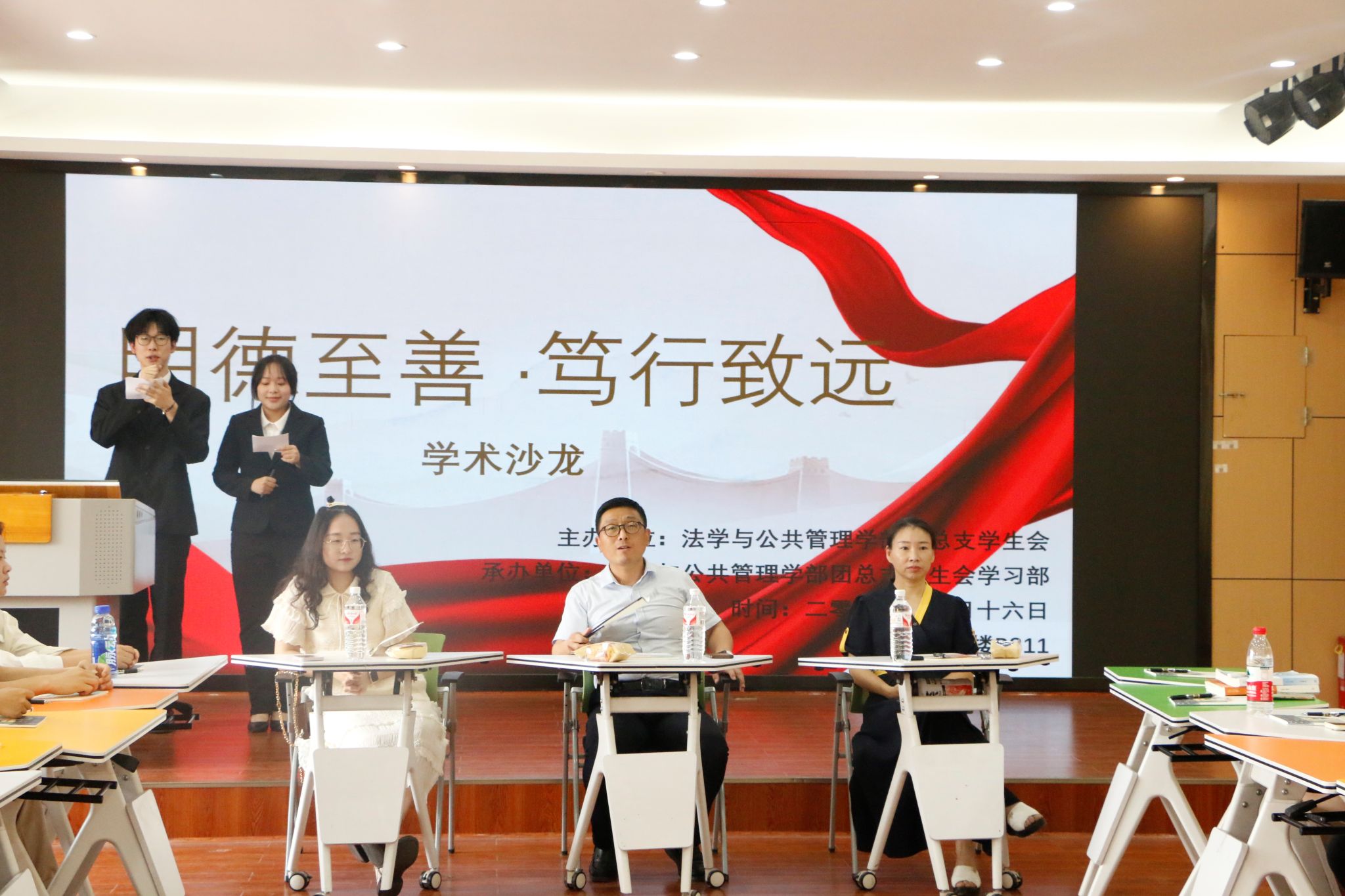 为落实贯彻“三全育人”教育理念,助力学生聚焦学科前沿、拓宽知识视野,在激发其学习热情的同时共同营造良好学术氛围,5月16日,法学与公共管理学院(下简称:法管学院)于实验楼B311教室举行了以“明德至善·笃行致远”为主题的学术沙龙活动。法管学院教师李怀宗、王小丽、杨华以及22级、23级学生代表参与此次活动。