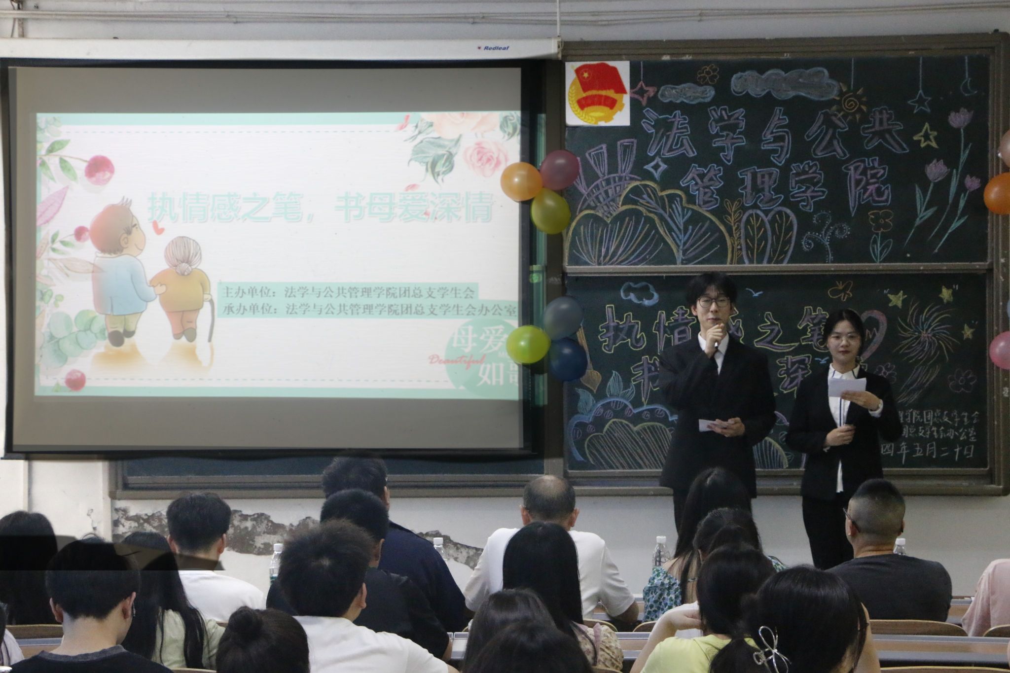 为落实贯彻“三全育人”教育理念,进一步加强大学生的感恩教育,引导其共同传承和弘扬中华传统美德,法学与公共管理学院(下简称:法管学院)于5月20日在初心楼103教室举行了以“执情感之笔,书母爱深情”为主题的书信活动。法管学院党总支副书记张波,学生工作办公室教师王馨、谢明聪以及团总支学生会主席团部分成员出席此次活动并担任评委。