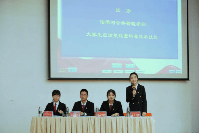 经过初赛、复赛以及半决赛的激烈竞争,共有四支队伍脱颖而出参与本次决赛,其中法管学院辩论队与数理学院辩论队角逐桂冠。本次决赛的辩题为“大学生应该注重创新能力还是技术技能”。法管学院辩论队作为反方,围绕“大学生应该更注重技术技能”展开论述。