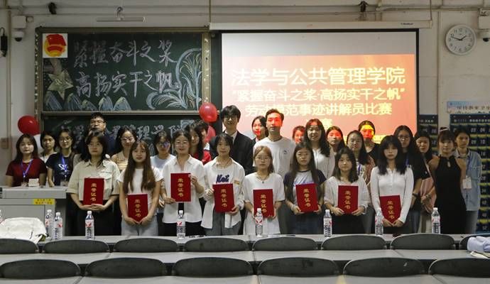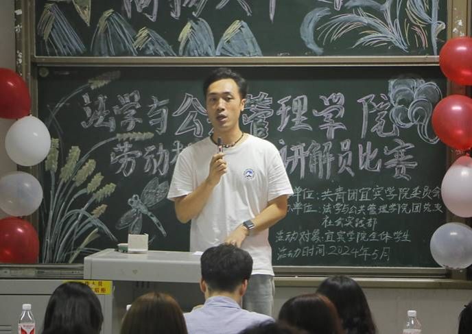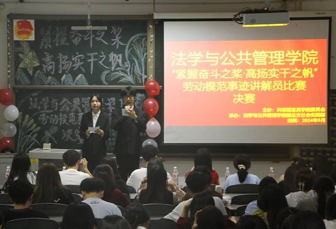 为落实贯彻“三全育人”教育理念,大力弘扬劳动精神,引导学生践行新时代劳动观,形成崇尚劳动、尊重劳动的氛围,5月29日,由共青团宜宾学院委员会主办,法学与公共管理学院(下简称:法管学院)承办的“紧握奋斗之桨·高扬实干之帆”劳动模范事迹讲解员比赛决赛在初心楼104教室举行。法管学院团总支书记王燕、学生工作办公室教师李成龙以及团总支学生会主席团部分成员受邀参与此次活动并担任评委。