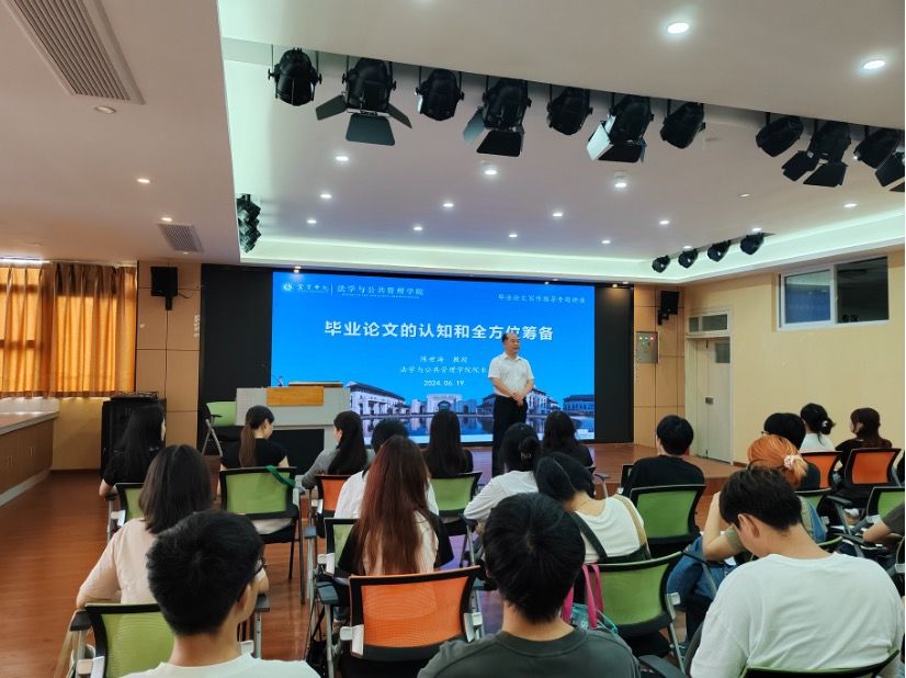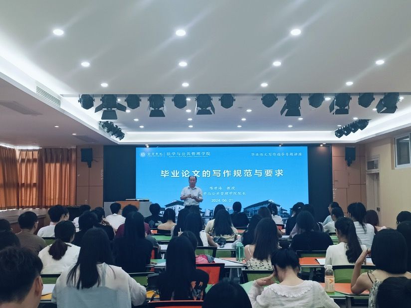 为强化对毕业论文的认知,规范毕业论文写作,提高毕业论文质量,助力学生学术素养。2024年6月19日和6月21日晚19点社工实训室311,法学与公共管理学院邀请了陈世海院长为2021级大三学生举办了两场毕业论文专题讲座。讲座题目分别为“毕业论文的认知和全方面筹备”、“毕业论文的写作规范与要求”。2021级大三学生聆听了本次讲座。