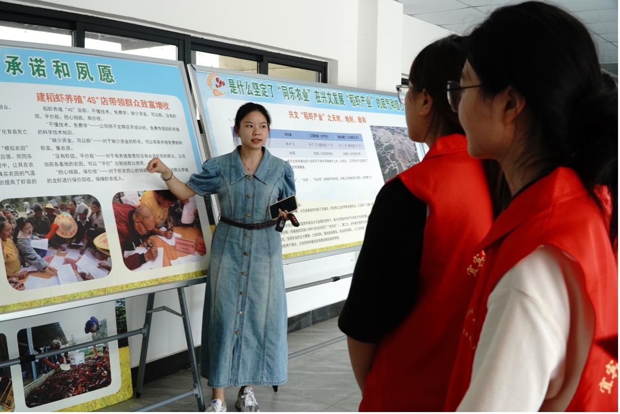 7月18日当天,禾为支队成员与兴文县委组织部副部长刘祥进行了深入交流,并对之后的工作进行了细致的规划。随后,在共乐镇党委副书记马天旭的带领下,禾为支队成员参观了同乐农业有限公司。该公司的稻虾共养模式,是兴文县农业转型升级的一大亮点,通过一季种稻,三季养虾,实现了“一水两用、一田双收”。紧接着,队伍来到兴文县粮油现代农业园区“五中心”,深入了解了“五中心”各功能板块的运行机制和实际成效:通过引进先进设备,搭建智慧化管理服务平台,从而满足更多更全面的培育需求。