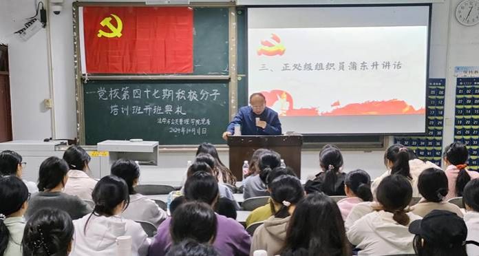 为全面贯彻落实新时代党的建设总要求,提高入党积极分子的政治素质和理论水平,10月11日,宜宾学院法学与公共管理学院党委于初心楼104教室隆重举行党校第47期入党积极分子培训班开班典礼。参加本次开班典礼的有正处级组织员蒲东升,第一学生党支部书记杨肖,第二学生党支部书记陈利敏,第三学生党支部书记王馨,党校班主任陈雨佳及第47期全体入党积极分子。培训班开班典礼由学生党员工作站负责老师陈利敏主持。