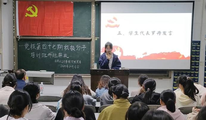 最后,学生代表罗丹发言,表示将珍惜这次培训机会,以饱满的热情、认真的态度参加此次培训,努力学习党的知识,积极参加社会实践,在今后的工作和生活中,严格要求自己,积极向党组织靠拢,争取早日成为一名合格的共产党员。
