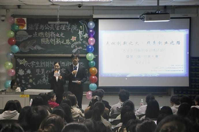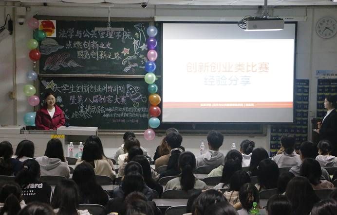 为落实贯彻“三全育人”教育理念,提升学生的创新创业认知与实践操作能力,进一步激发学生的潜能与创造力,10月25日,法学与公共管理学院(下简称:法管学院)于初心楼104教室举办了以“点燃创新之火·照亮创业之路”为主题的大学生创新创业训练计划暨第八届创客大赛宣讲动员会。法管学院学生工作办公室教师贺莉以及2021级学生张齐兵,2022级学生杨云凤、李娱其出席本次活动。