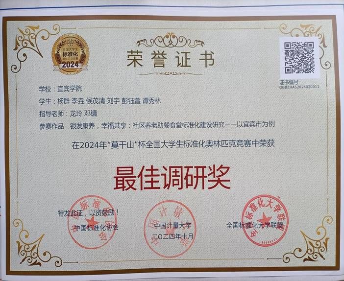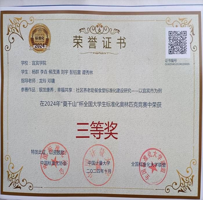 2024年10月13日“莫干山”杯全国大学生标准化奥林匹克竞赛决赛在浙江省湖州市德清县成功举行。本次竞赛由中国标准化协会、中国计量大学、全国标准化大学联盟主办。宜宾学院法管学院1支队伍入围决赛,获得全国三等奖和“最佳调研奖”全国单项奖。