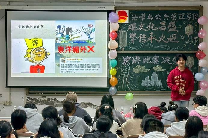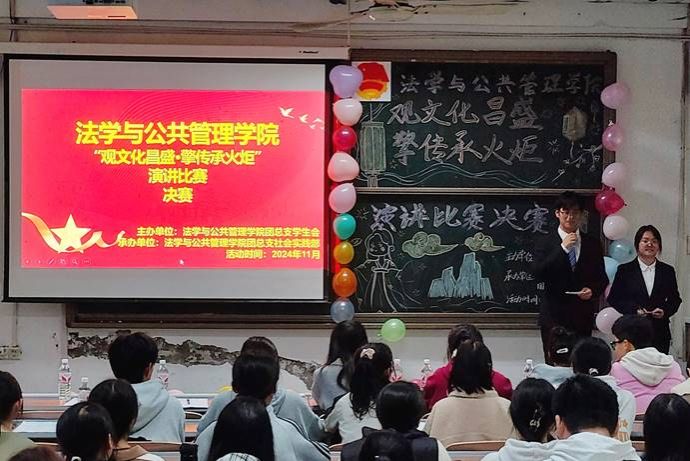 为落实贯彻“三全育人”教育理念,弘扬中华优秀传统文化,培养中华文化的传承者和创新者,11月7日,法学与公共管理学院(以下简称:法管学院)于初心楼103教室举办了以“观文化昌盛·擎传承火炬”为主题的演讲比赛决赛。法管学院学生工作办公室教师宋晚秋、李成龙以及团总支学生会主席团部分成员出席本次活动并担任评委。