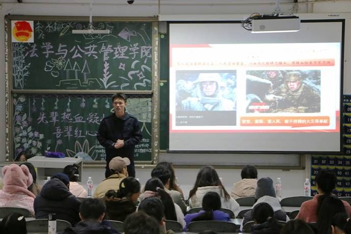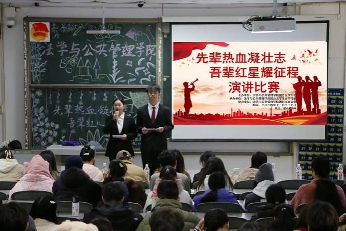 为贯彻落实“三全育人”教育理念,缅怀革命先烈,传承红色基因,激发同学们的爱国情怀和奋斗精神,11月27日,法学与公共管理学院(以下简称:法管学院)于初心楼104教室举办了以“先辈热血凝壮志・吾辈红心耀征程”为主题的演讲比赛。法管学院学生工作办公室主任王燕,学生工作办公室教师宋晚秋、李成龙以及团总支学生会主席团部分成员出席本次活动并担任评委。