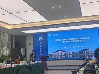 冯嘉华老师的报告题为“性别观念、家庭权力如何影响农村女性选举参与?——基于主观社会地位的调节效应”。该报告基于中国家庭追踪调查数据,探讨了性别观念和家庭权力结构在农村地区如何影响妇女的选举参与。冯老师通过实证研究,提出了主观社会地位在性别观念与家庭权力交织中的调节作用,为今后在性别研究领域的政策制定与社会实践提供了重要参考。