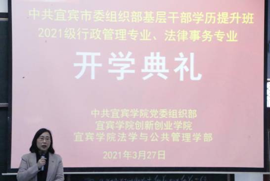 2021年3月27日上午,中共宜宾市委组织部基层干部学历提升班2021级行政管理、法学事务专业开学典礼在硕勋楼B座202教室举行。典礼由法学与公共管理学部党总支副书记单琰秋主持,学院党委组织部、创新创业学院、法学与公共管理学部领导以及新生班主任出席了本次典礼。