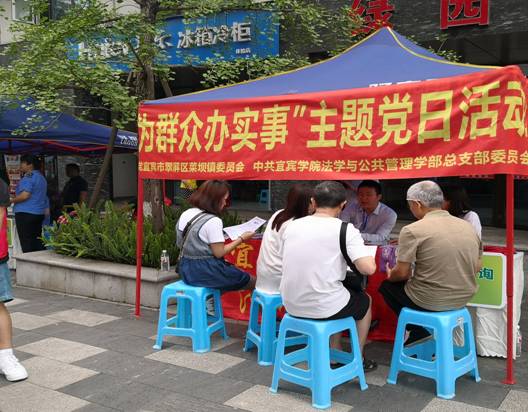 法管学部党总支积极开展党史学习教育,创新学习教育形式,牢固树立人民中心理念,切实践行群众路线。2021年5月12日,法管学部党总支与菜坝镇党委联合开展“为民众办实事”主题党日活动,为翠屏区菜坝镇绿园小区和幸福村提供法律服务活动。法管学部党总支刘廷华、李凤军、李海滨、李薇苇等一行10余人清晨就赶到活动现场,布置好服务阵地,为法治宣传、法律咨询和法律援助等服务活动做好充分准备。