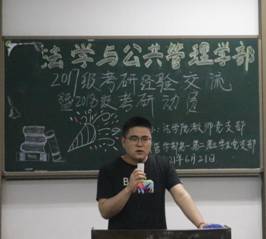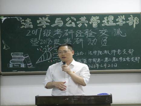 活动伊始,法学院教师党支部刘廷华教授介绍了本次会议的重要意义,劝诫同学们珍惜大好光阴,下够决心、鼓足信心、加倍努力、掌握技巧,实现考取名校的梦想。李凤军教授在讲话中鼓励同学们拿出年轻人敢于拼搏的精神,不要因为考研辛苦就有畏难情绪,不要错过黄金期,让将来的自己后悔。