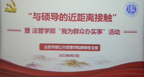 法管学部公管学院教师党支部联合学部团总支、学部学生党支部于2021年6月23日初心楼模拟法庭举办了“与硕导的近距离接触”暨法管学部“我为群众办实事”活动考研分享会。重庆理工大学硕士生导师陈启亮博士、重庆工商大学硕士生导师车四方博士和西南大学硕士生导师张明博士莅临交流会,法管学部部长何一、副部长周陶出席活动,学部团总支书记王燕主持此次大会。