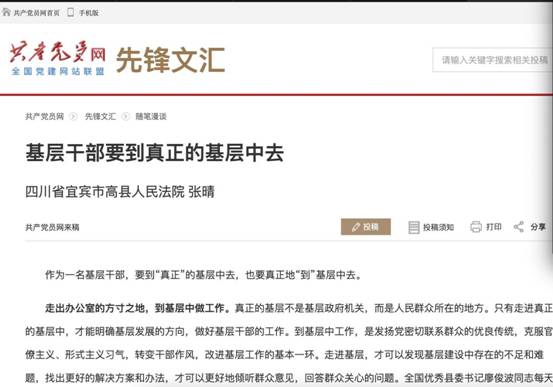 张晴同学撰写的组工文章《基层干部要到真正的基层中去》被中组部主办的共产党员网编辑推荐,撰写的通讯文章《高县人民法院党组召开党风廉政建设和反腐败工作推进会》在宜宾市政法委主办的宜宾长安网上发布。