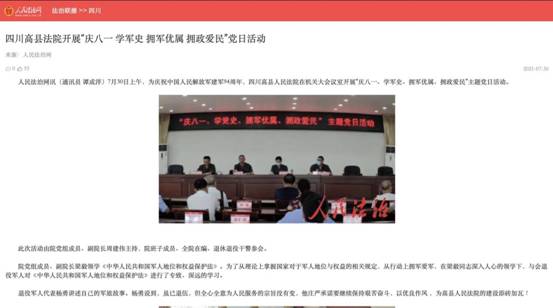 谭成洋同学撰写的通讯文章《高县法院举办“庆八一、学军史、拥军优属、拥政爱民”主题党日活动》在人民法治网和宜宾长安网上刊载。