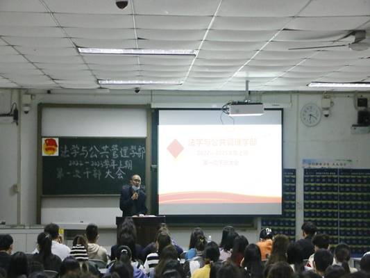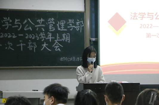为全面贯彻党的教育方针,落实立德树人根本任务,同时推进新学期学生工作顺利开展。11月2日,法学与公共管理学部(下简称:法管学部)于初心楼104教室举行2022-2023学年上期第一次干部大会。学部党总支副书记张波、团总支书记王燕、学工办教师以及全体学生干部参会。