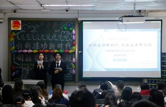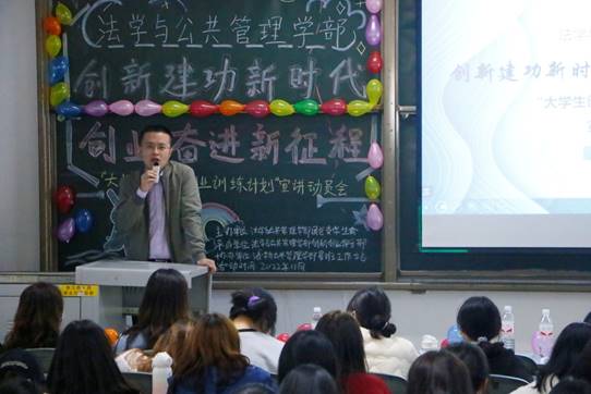 为加强创新创业人才队伍建设,让更多的学生参与创新创业创造的实践和训练。11月27日,法学与公共管理学部(下简称:法管学部)在初心楼104教室开展“创新建功新时代,创业奋进新征程”大学生创新创业训练计划主题宣讲会。实践与创新中心主任李凤军,教师庞豪、黄东,学生代表钟一帆、胥树新以及团总支学生会主席团成员参会。