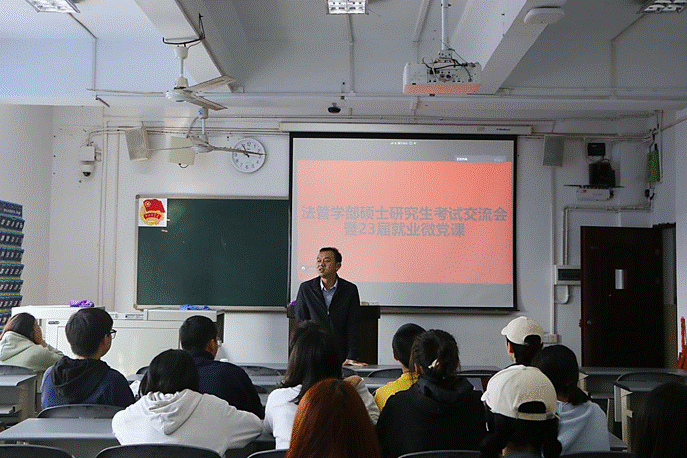 筑梦考研路,青春正当时。为提升学部学子考研复试通过率,推进学生就业工作高质量发展,法学与公共管理学部(下简称法管学部)于3月11日在初心楼306教室举办了硕士研究生考试交流会暨2023届就业微党课。本次活动特别邀请了西南大学陈教授进行讲座,法管学部副部长、公共管理学院院长周陶出席会议。