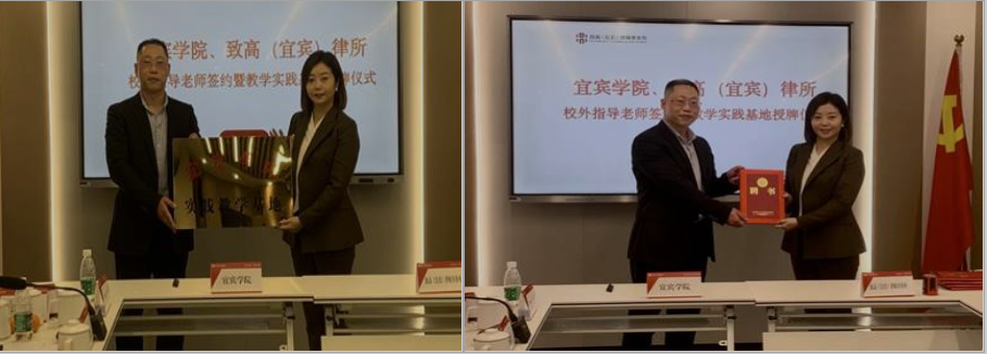 座谈最后,双方举行了宜宾学院法管学部毕业论文校外指导老师签约仪式暨实践教学基地授牌仪式,刘廷华书记向在场的致高律所校外毕业论文指导老师颁发聘书。