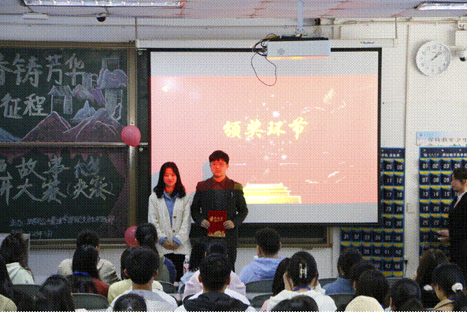 最后,由主席团成员为获奖选手颁发证书。2022级2班刘星宇同学用自己抑扬顿挫的语调和丰富的情感征服了评委与现场观众,荣获此次大赛的第一名。