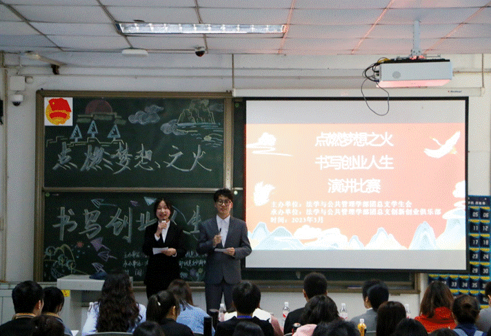 为深入贯彻新发展理念,提升同学们理论知识应用能力,激发人才创新活力,3月20日中午,法学与公共管理学部(下简称:法管学部)于初心楼104教室开展了以“点燃梦想之火·书写创业人生”为主题的征文演讲比赛。法管学部学生工作办公室主任王燕,学工办教师杨肖、刘顺鑫以及团总支学生会主席团成员出席本次活动并担任评委。