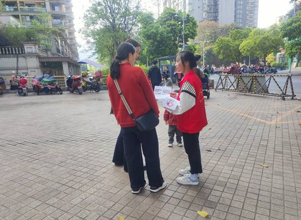 毒品问题是当今国际社会面临的一个严重的社会问题。为进一步提高居民的禁毒意识,增强居民识毒、防毒、拒毒能力,宜宾学院法学与公共管理学部(下简称:法管学部)团总支青年志愿者队于4月1日在宜宾市翠屏区西郊街道金沙江社区开展“拥抱健康,亲近幸福,远离毒品”志愿服务活动,宣传禁毒知识。