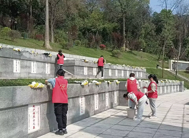 现场师生在青松与翠柏的映衬下,举行了庄重肃穆的英烈缅怀仪式。全体师生瞻仰烈士墓碑,向长眠在此的烈士深深鞠躬、低头默哀,致以崇高的敬意和深切的悼念。在一座座碑刻前,同学们细心整理墓前的菊花,认真拭去碑上的浮尘,轻轻触摸烈士的名字,感受革命先辈伟大的民族精神和气节,寄托学部师生对革命先烈的哀思。