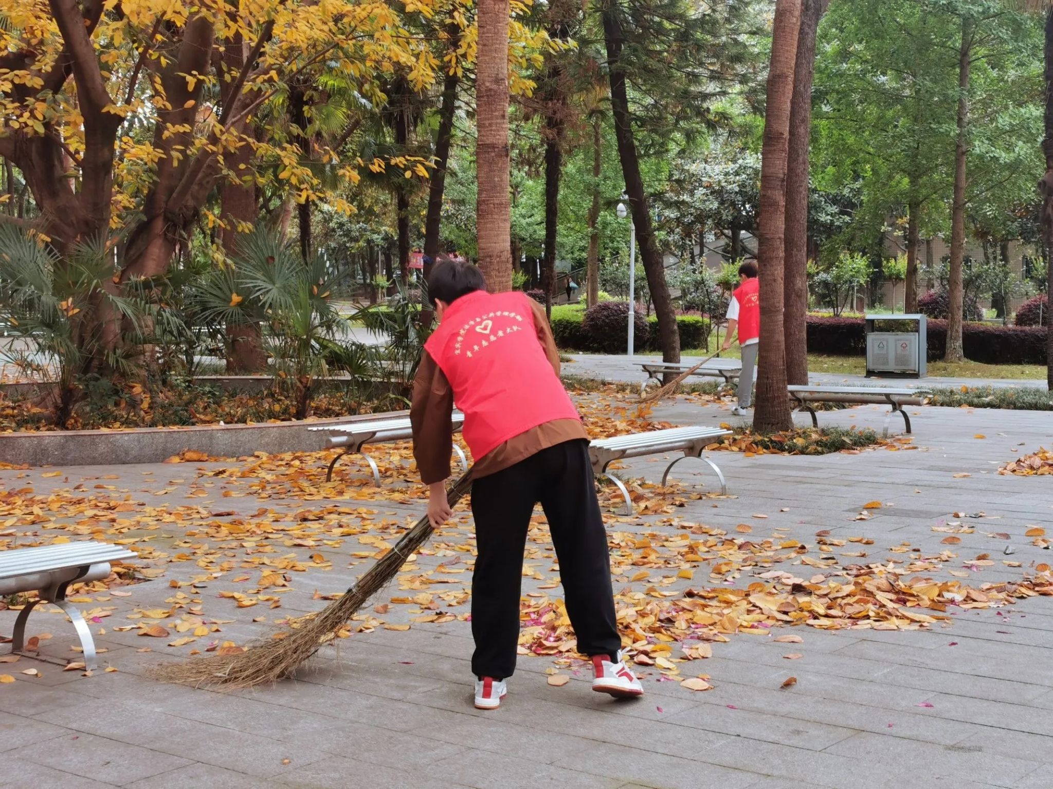 活动伊始,志愿者们分工明确,互帮互助,以“无死角、零盲区、全覆盖”为原则,积极配合环卫工人一起对垃圾和树叶进行了细致的清理,迅速高效地清洁完成原定的责任区域后,又主动协助环卫工人打扫其他区域。活动过程中,志愿者们充分发扬了志愿服务精神。不怕脏、不怕累,干劲十足,通过大家的共同努力,校园环境变得更加清新美丽、整洁有序。