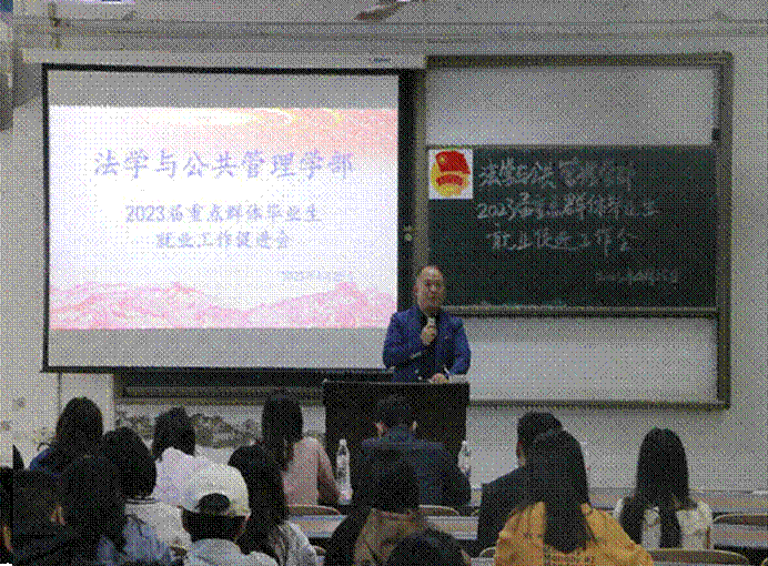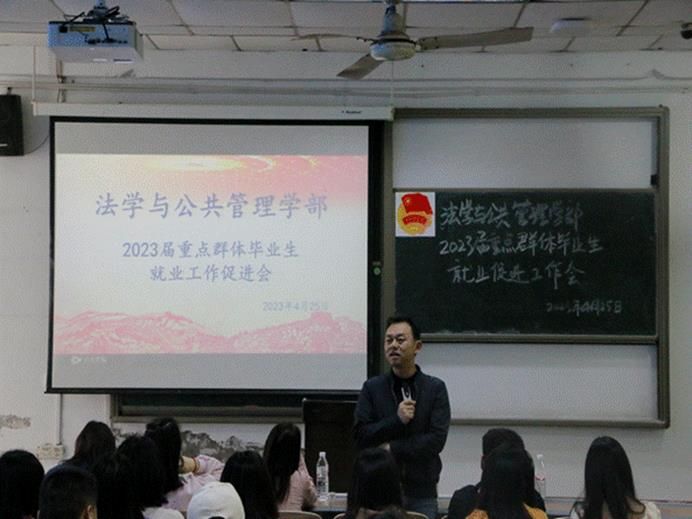 为深入贯彻党的二十大精神,落实习近平总书记来校考察时关于高校毕业生就业工作的重要指示,进一步做好毕业生重点群体就业帮扶工作,4月25日,法学与公共管理学部(下简称:法管学部)于初心楼104教室召开2023届重点群体毕业生就业工作促进会。法管学部党总支副书记(负责工作)刘廷华,部长陈世海,副部长周陶以及各毕业班辅导员出席本次会议,在校重点帮扶学生参会。