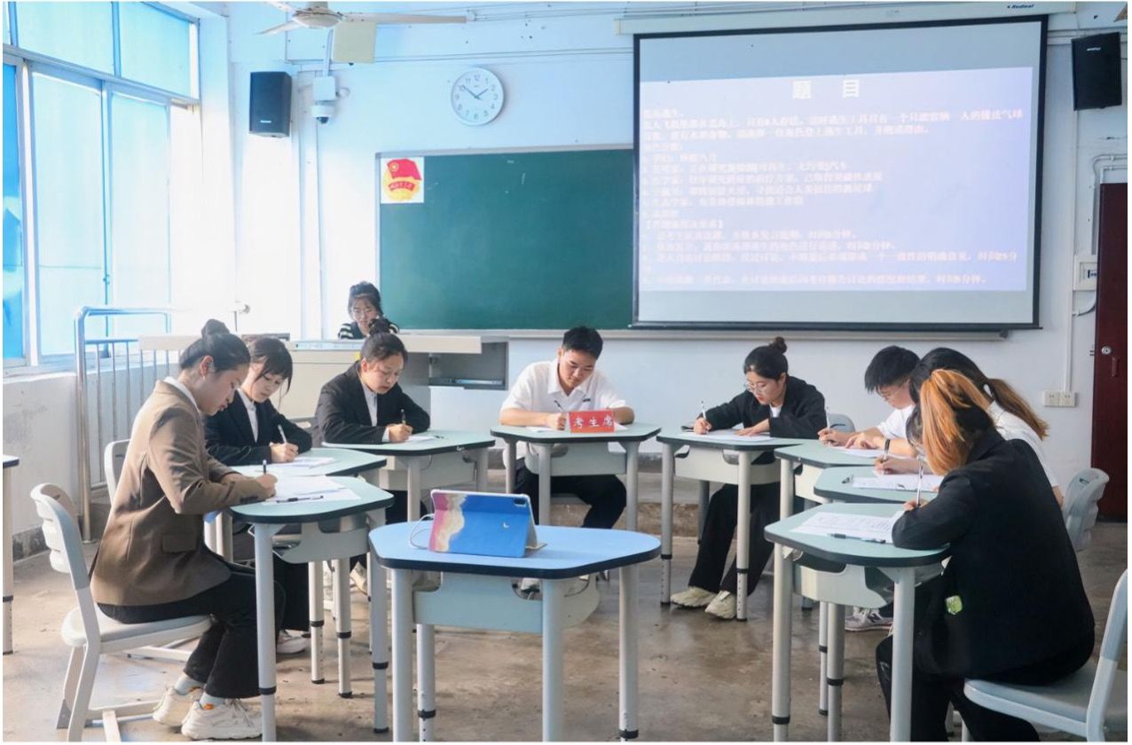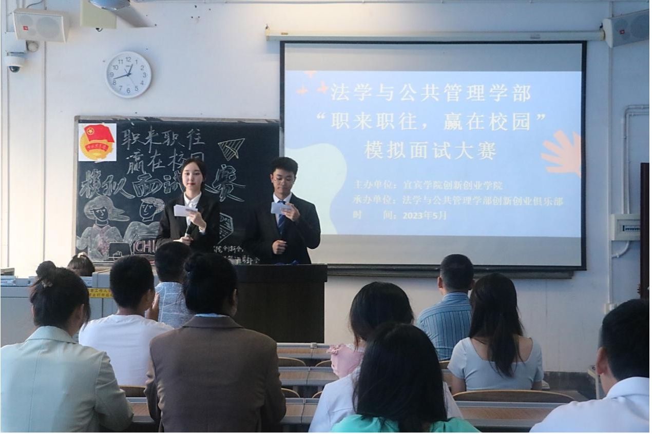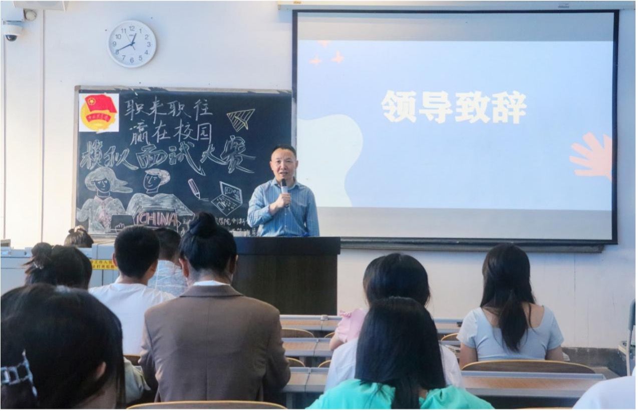 为落实学习贯彻习近平新时代中国特色社会主义思想主题教育内容,推动高校就业指导工作的开展,提高学生求职面试能力,法学与公共管理学部(下简称:法管学部)于5月17日在初心楼501、502教室开展了“职来职往,赢在校园”模拟面试大赛。法管学部教师王毅、娄崇、冯嘉华、贺莉,及团总支学生会主席团成员出席本次比赛并担任考官。
