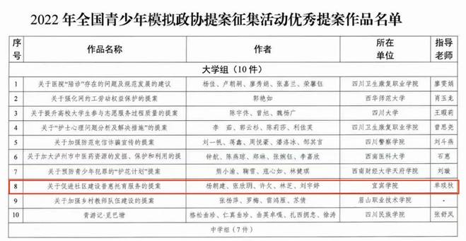 为更好地发挥共青团桥梁纽带作用,引导青少年了解并有序参与中国特色社会主义民主政治建设,2022年7月至12月,共青团中央维护青少年权益部、中华全国学联秘书处共同开展2022年全国青少年模拟政协提案征集活动。近日,征集活动结果出炉,四川省19件作品入围全国评审,其中4件获评“模拟政协提案最佳作品”、3件获评“模拟政协提案优秀作品”。其中,我校申报的《关于促进社区建设普惠托育服务的提案》荣获2022年全国青少年模拟政协提案征集活动优秀提案作品。作品由法学与公共管理学部党总支副书记单琰秋指导,学生成员包括杨朝建、张欣玥、许欠、林芝、刘宇婷。