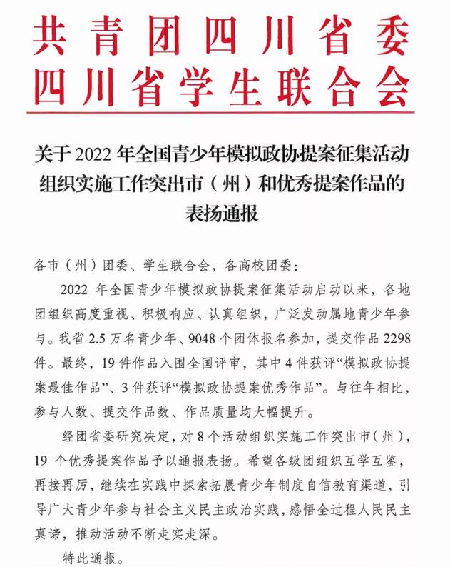 为引导广大青少年参与社会主义民主政治实践,感悟全过程人民民主真谛,推动模拟政协提案活动不断走实走深。团省委决定对8个活动组织实施工作突出市(州),19个优秀提案作品予以通报表扬。