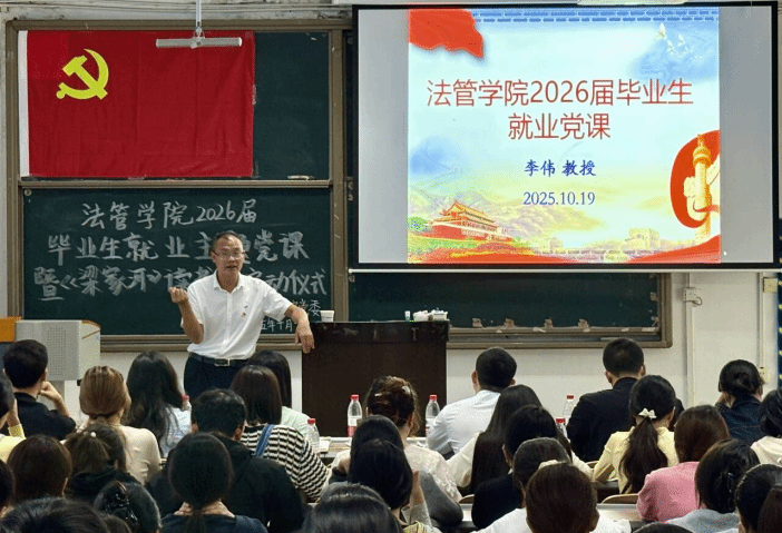 为了深入践行习近平总书记来校视察的殷殷嘱托,激励学生党员客观看清自己的实际,以平实之心扎根基层、服务人民,10月19日,法管学院党委于初心楼214教室召开2026届毕业生就业主题党课。本次会议由周林老师主持,党委副书记(主持工作)李伟主讲,参与人员有党委副书记、纪委书记罗春,学工办主任王燕,学工办副主任杨肖,第一、第二、第三学生党支部书记李成龙、谢明聪、王馨,委员曾晓琴、陈利敏、宋晚秋,以及70名学生党员和38名发展对象。